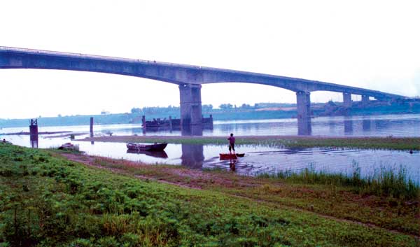 天門漢江大橋長1329米,主橋孔跨布置為(50 60) (85 116 116 85) (50 50)米三聯預應力混凝土連續梁橋,橋寬14.5米,主跨116米,樁基107根,樁徑2米,預應力混凝土連續變截面箱梁結構,于1996年建成,被交通部授予“優質工程”。