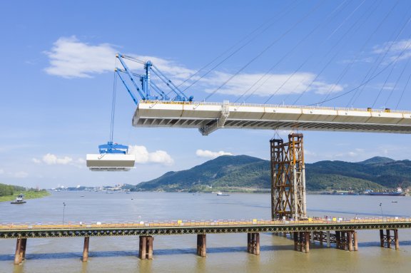 大跨徑提籃式鋼箱系桿拱橋鋼格構柱支架原位拼裝鋼拱肋施工技術、大矢跨比超高鋼箱主拱肋中跨低位拼裝液壓同步提升合龍施工技術