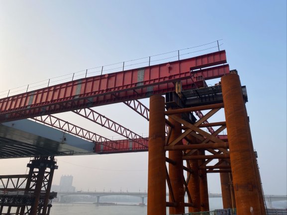依托丹江口市水都二橋工程,研發了大噸位龍門吊與鋼梁拼裝平臺共用支架技術、大跨徑大斷面鋼箱梁拼裝線性變形控制技術及鋼箱梁節段精準對接補強連接技術,解決了龍門吊支架與鋼梁拼裝平臺支架交叉混亂、龍門吊軌道場地要求高的難題,提高了鋼箱梁節段對接安裝精度和連接強度,在有效工期內完成了各項指標,獲得社會各方的高度好評。