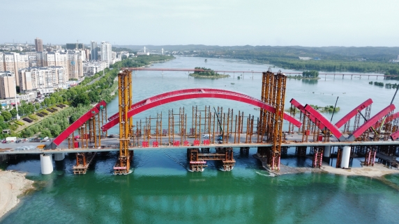依托丹江口市水都二橋工程,研發了一種拱肋原位支架快速安拆技術、拱肋吊裝高空精確調整定位技術、多因素影響鋼箱拱肋溫差變形預測技術,提出了中跨拱肋低位拼裝同步提升合龍技術,研制了液壓動力系統提升裝置,采用了視覺位移監測系統,提高了拱肋原位支架安拆效率,全方位確保拱肋提升質量與安全。